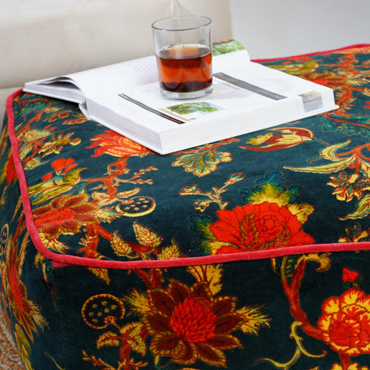 Tree of Life Velvet Square Ottoman / bean bag -Bottle Green
