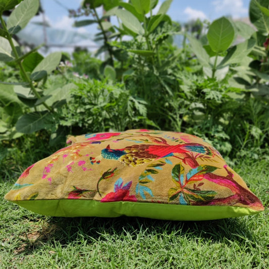 Birds of paradise Velvet Cushion Cover- Khaki Yellow