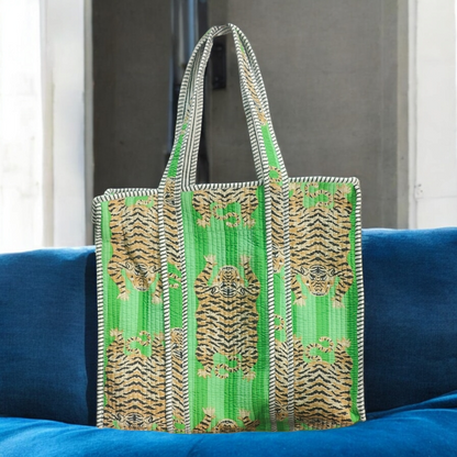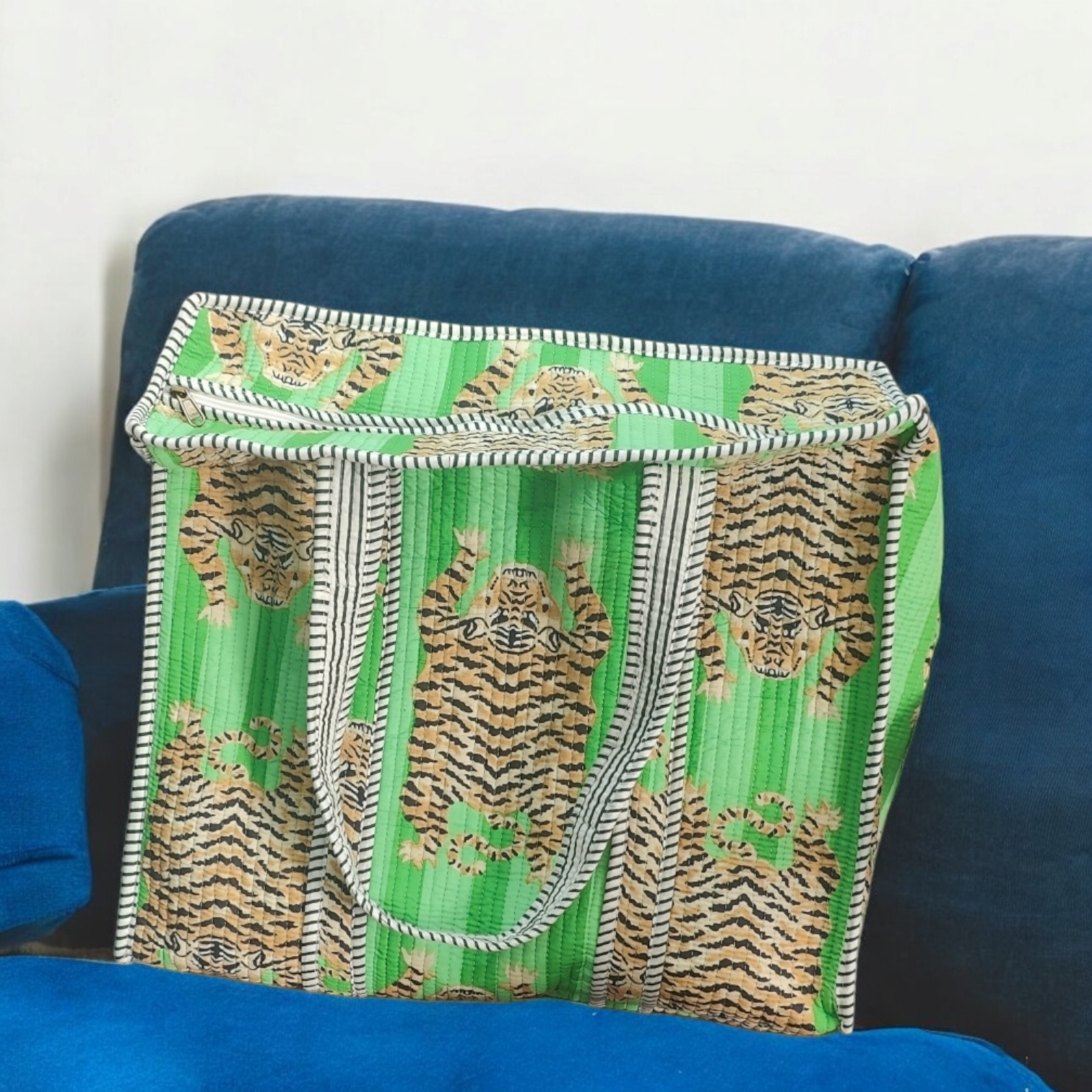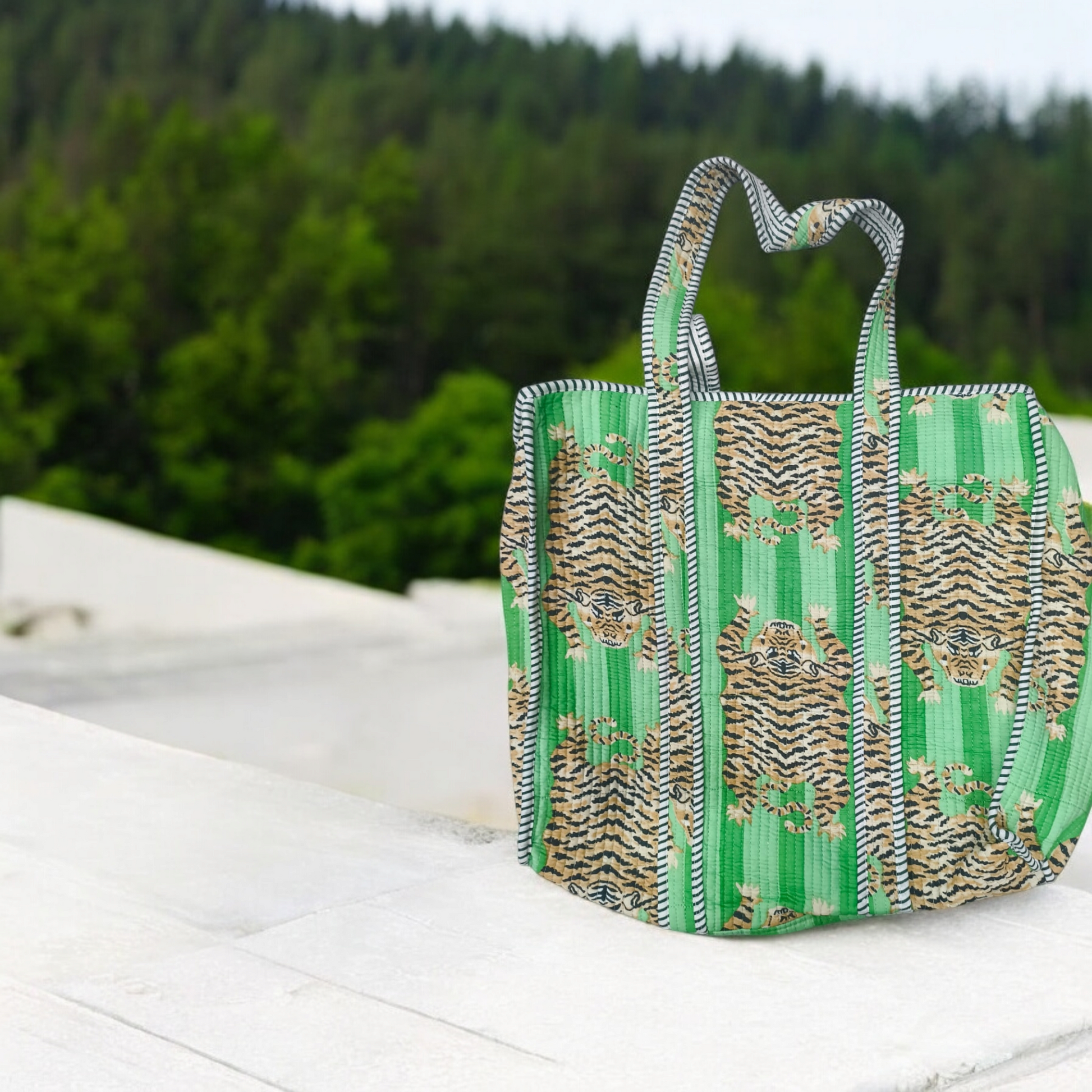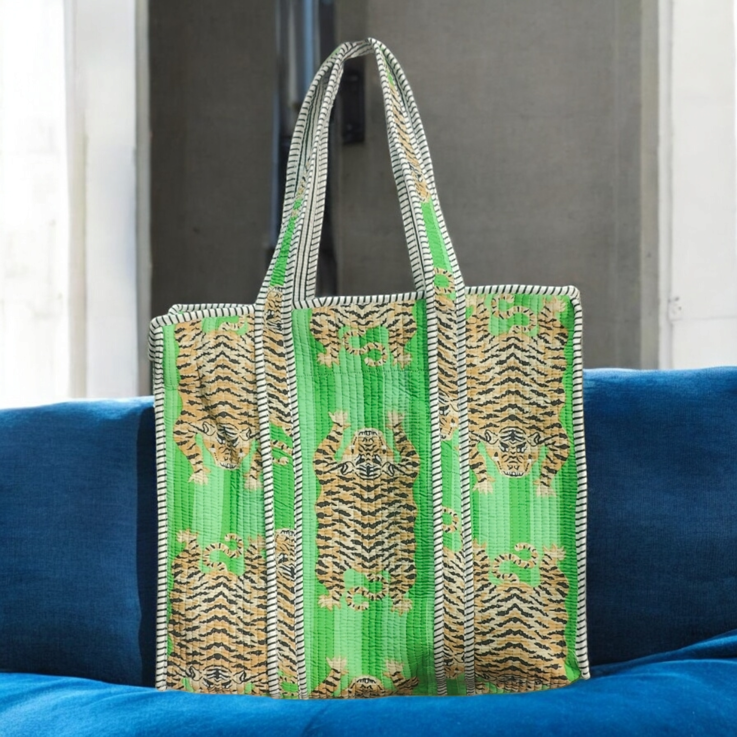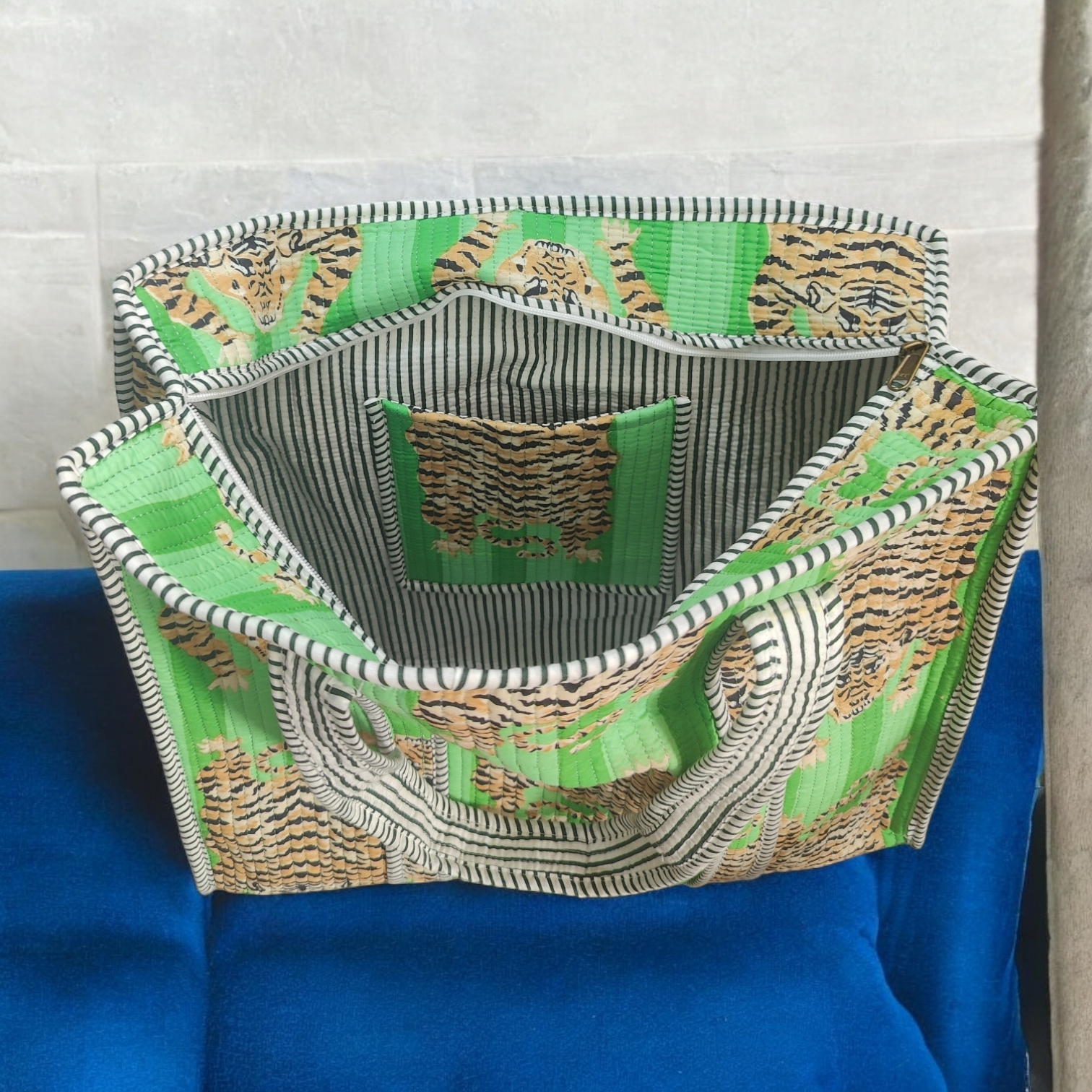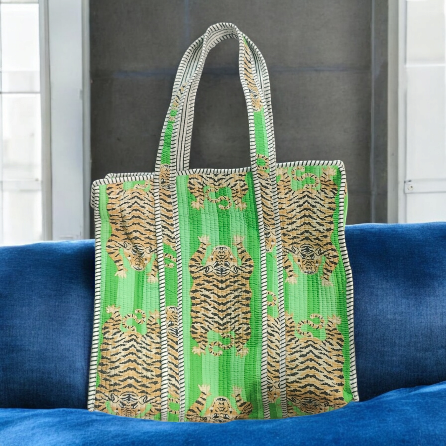 Carry your essentials in style with our handmade, reversible quilted tote bag! Take it with you to work or on a shopping trip; the washable fabric will look like new with just a quick wash. Keep your goodies safe with an inner pocket designed for all your must-haves. Look and feel great in this fun and fashionable bag!