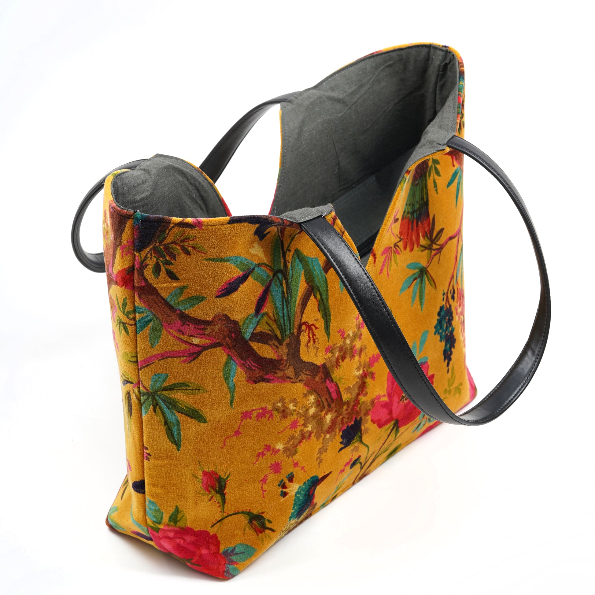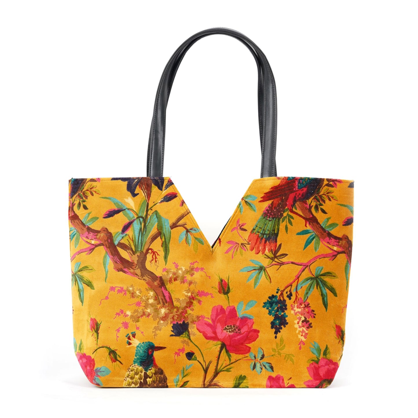 Unleash your daring side with our Birds of Paradise V Cut Hand Bag in Mustard Yellow! Made with luxurious cotton velvet, this stylish hand bag is sure to make a statement wherever you go. Stand out from the crowd and add a touch of adventure to your wardrobe with this bold and eye-catching accessory.