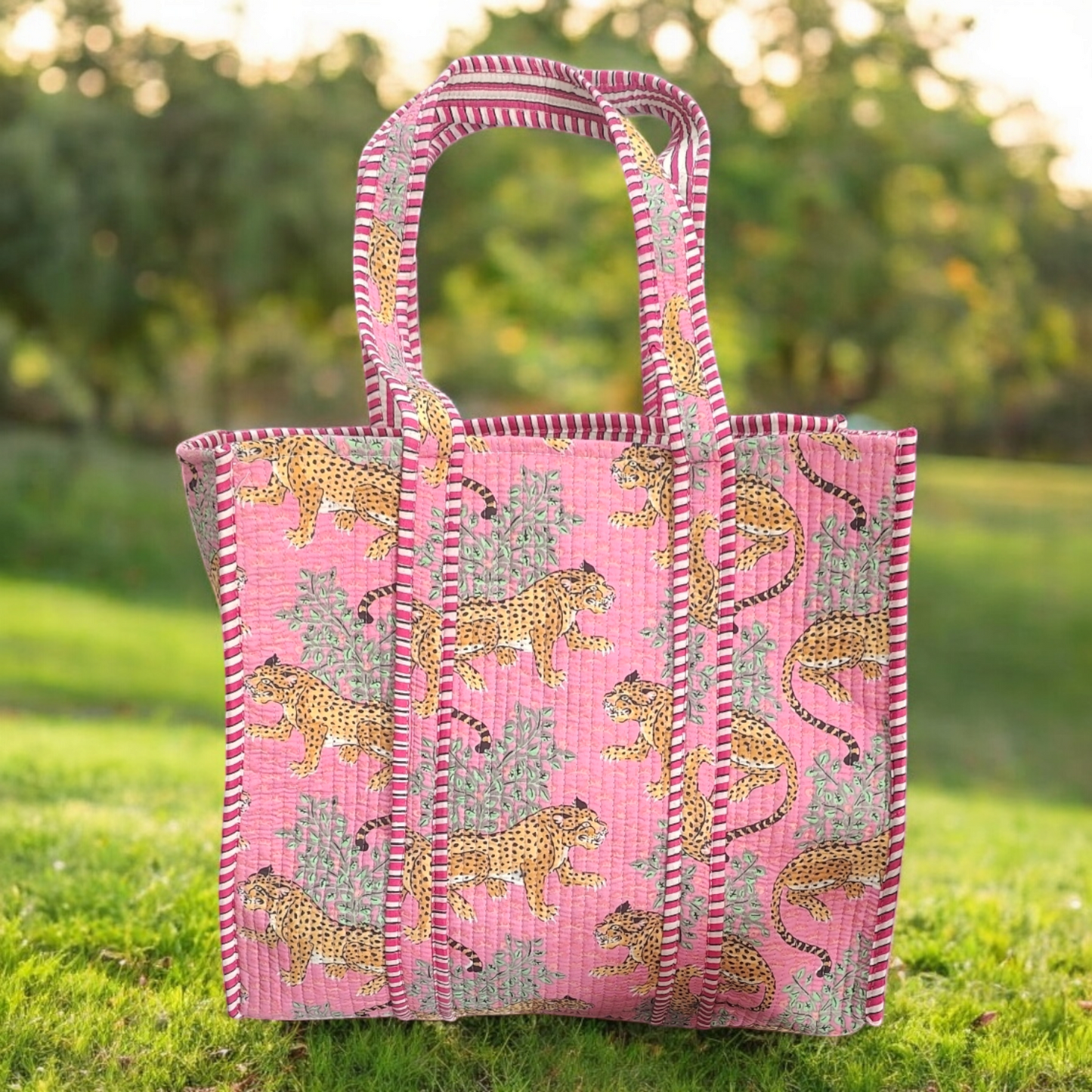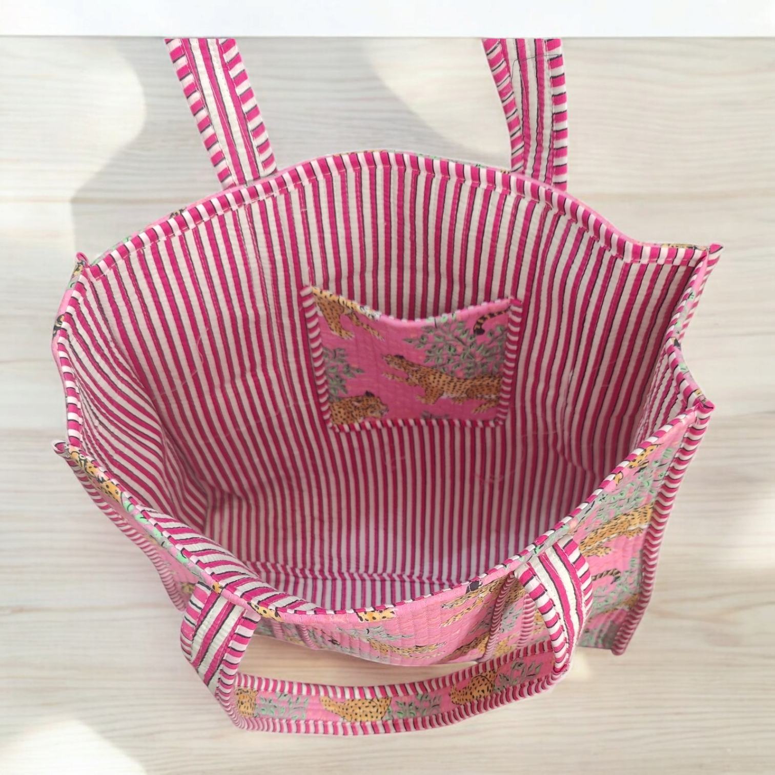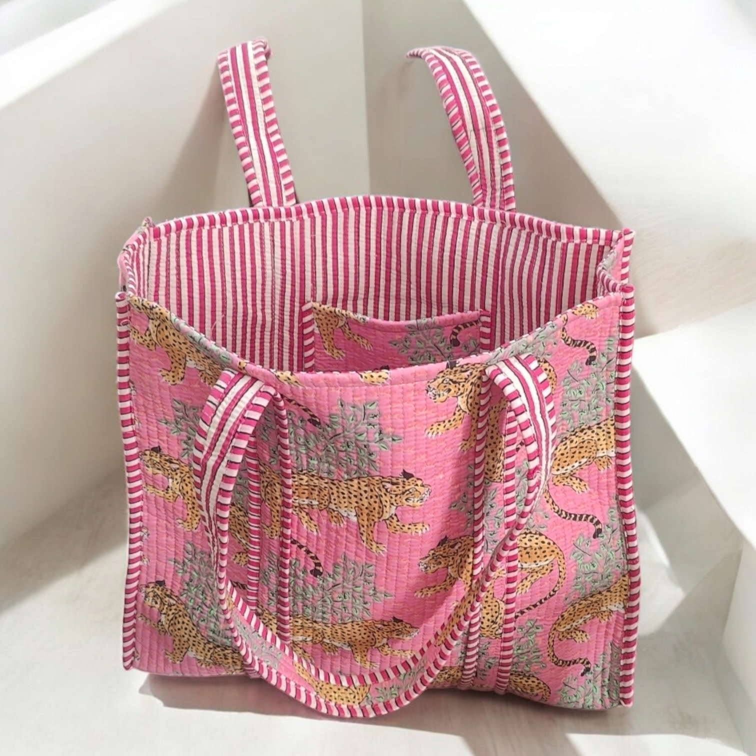 Carry your essentials in style with our handmade, reversible quilted tote bag! Take it with you to work or on a shopping trip; the washable fabric will look like new with just a quick wash. Keep your goodies safe with an inner pocket designed for all your must-haves. Look and feel great in this fun and fashionable bag!