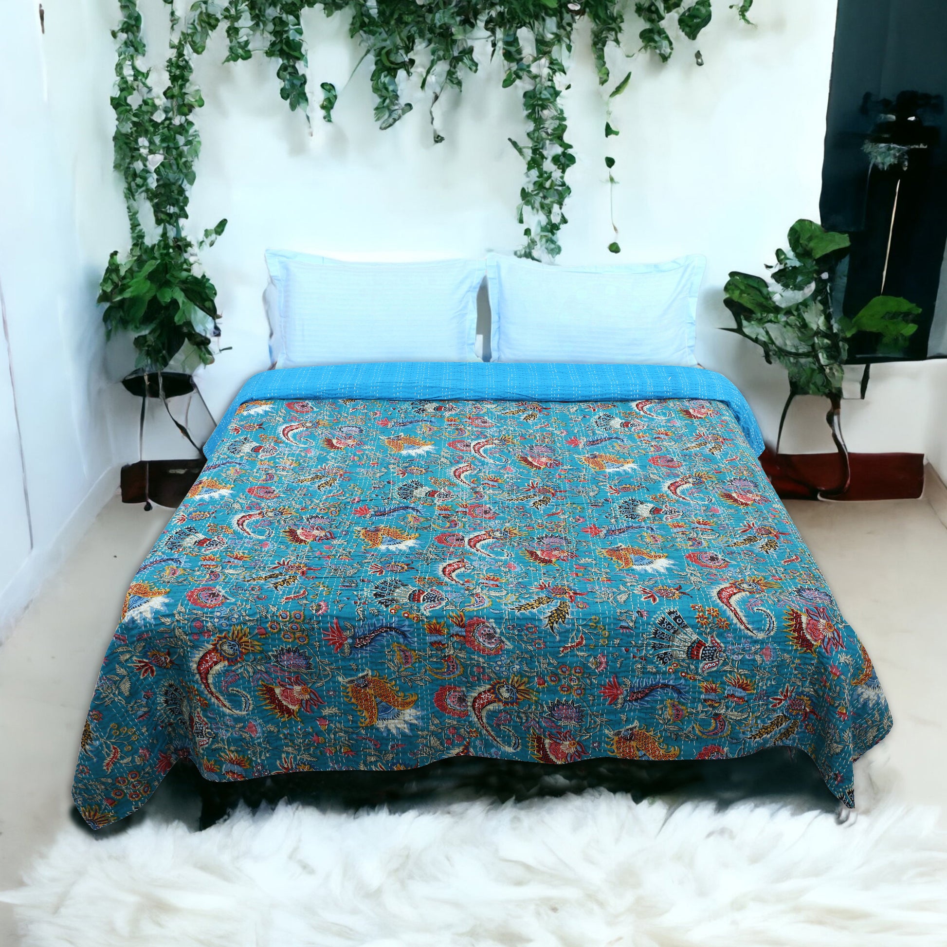 Bring home this one-of-a-kind Kantha Bedcover and cozy up in handmade luxury. With its beautiful kantha quilting and generous 90x100 inch size, this bedcover is sure to be the star of your bedscape. Snuggle up and sleep tight!