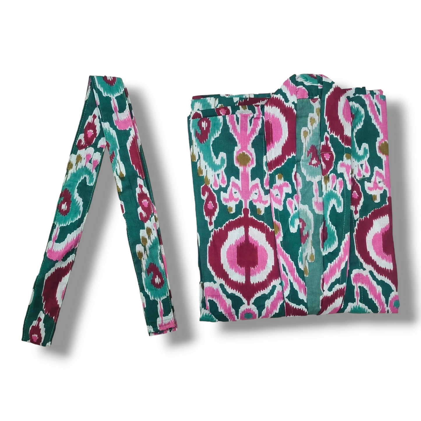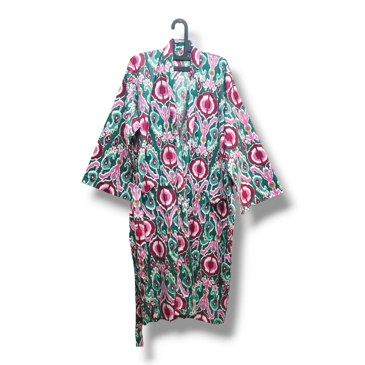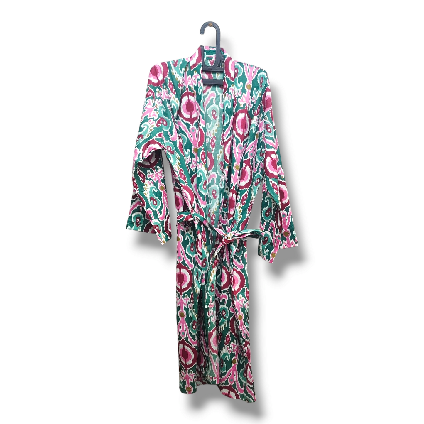 Cotton Hand Printed Kimono Robe Pink and Green Ekat