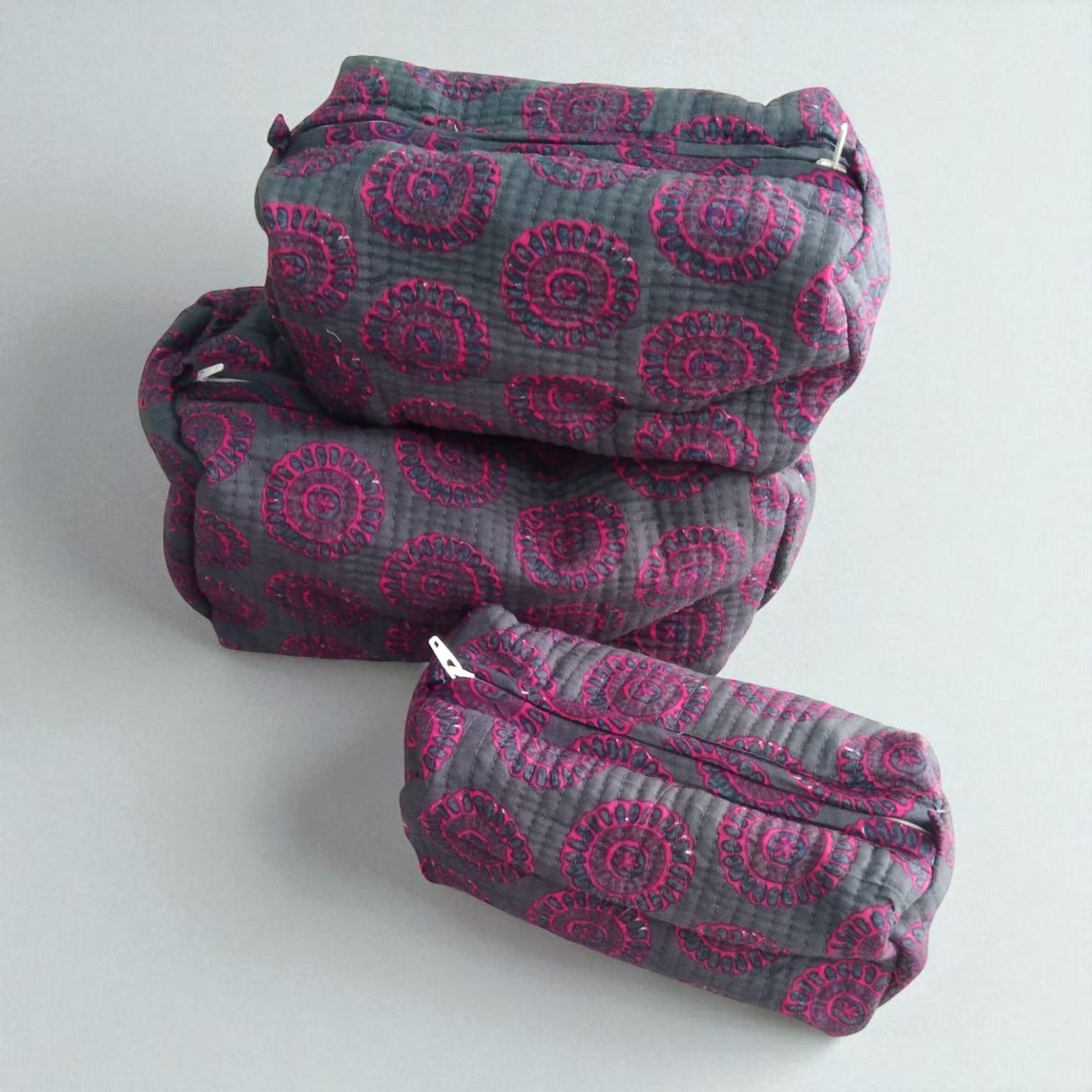 "Keep your cosmetics organized in style with this set of 3 quilted cotton vanity bags. The inner lining is waterproof for easy cleaning and the beautiful prints add a touch of personality. Perfect for the quirky fashionista (with a lot of products) in your life!"